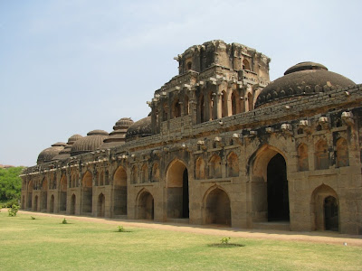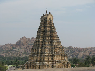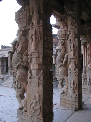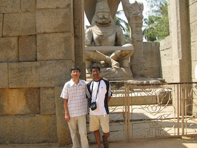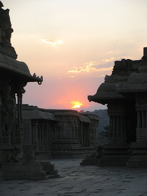 The humps and the bumps of the road had a telling effect on our opinion of the yogasutras outside our lodge facing the Virupaksha temple. Musty bedsheets and rattled bowels cleansed, we set out on hired bicycles to explore the ancient ruins of the Vijayanagara capital of Hampi. As the cauldron blazed atop our heads, we stood the heat up and entered the temple. Couple of Garbhagriha visits later, we were left having to be awed by the monolith pillars, Yalis and pesading horses. Pachyderm assuagement and minority brownization later, we were exiting the doors to face the sun one more time. Cycling our way uphill, we were to come face to awed-face with the 4.5m huge, monolith Ganesha. Kadlekai Ganesha was uber-massive, so much so that only flashes of selective flesh made the cut to the sensor. Later, a series of Jaina-style Shaiva mandirs were seen along the downward slope. Firangs rubbed sun-lotion on each other's backs as I had my bladder relieved and studied the lintels and toranas of the ancient temples. Explaining whatever I could, we romped the unreal terrain scrounging for a chance to elucidate. The style and architecture represents, it seems a symbolism. To play out Earth on Earth. Walked back to the cycles and chatted up with the Aato rajas. Admired the less massive, but more elegant Sasivekalu Ganesha from a distance and headed towards the Krishna temple. Finally found some brown company there. Well, almost. Fine, intricate structures atop the crude granite slabs propels the faith of the sculptsman. Out-of-the-world Apsaras with the finest of endowments hold up motifs of the Dashavatara of Vishnu. Endlessly colonnaded halls were walked by, turtles in a holy water site were tolerated and citizenly activities performed. Eventually, we got out and headed towards the monolith Narasimha that sat majestically beneath no shelter. The Badavilinga neighboured him in space and not comfort zone - it came with a shelter. Frantic praying and more awe-inspiration later, we cycled some more distance further up and visited the less grand Chandikeshwara temple and passed on the Veerabhadra temple. Our gastric call became all too strident and we cycled to this cool restaurant called Mango Tree. Lunching with the firangs, the concept of Roti Curry was once again back to being national pride. A good meal later, we travelled back to the Main Bazaar and walked to its end to see the monolith Nandi that sits opposite the temple. This was also the base of the Matanga hill that would be scaled tomorrow. Presently, we saw ourselves manoeuvring the trippy terrain to reach the Achyutha Raya temple and wonder at it's collonaded halls and 500 year-old themes. Down this temple street was the Courtesan's street or the Soolai Bazaar. After a visit to the dry Pushkarni, we set out for the Viththala temple. This was supposed to be one of the more crucial spots in the Hampi itenarary, given its Stone chariot and musical pillars. The sunlight was receding as quickly as the gastric juices were rising. It was truly a grand site to watch the sun bid his goodbye with the temple at its foreground. A better photographer would have made much better use of the eerie play of light and cloud. The renovation at the main temple forced us to admire the acousitc brilliance of the Tuluvas from down below. As the moon came upon to twinkle upon the sky, we bid the majesty goodbye and frantically walked our way back to base camp. We recevied some real shady assistance and it was a wonder we returned safely on the other side. Picking our cycles from the traffic police station, we came to the Italian wooden oven restaurant. The trippy place had art on sale and the music, along with the people around had my senses heightened. Al Fungi, Falafel and Veg Sizzler later, we were down and out. There was a desparate move to score some pot but that didn't happen. The night passed on with quite a few incidents. The village without power and my sleep absent without the exercise. Eventually I had a very good sleep and we woke up the next day to find the sun already having risen. Not wanting to let that dampen our hopes, we still made sure we climbed the Matanaga hill, in the blissful heat of the morning sun. The trek was a little treacherous and we were well rewarded with coffee on top. After making it back down, we went to this place that was recommended in the Lonely Planet. The food was filling and we got our cycles back to exploring the ancient ruins. The site of a mutual support between two massive rocks has come to be called the Sister Rocks. Then, we visited the underground temple that was full of water at the Garbagriha. After a visit here, we visited the series of Islam architecture buildings that also characterised the Vijayanagara style to some extent. The ruins of the noblemen's quarters and all the royal buildings are extant only in foundations. We then came to the Hazara Rama temple. This temple has stories of Ramayana and the Luv-Kush story etched forever on it's walls. After circling the temple, chasing the plot, we chose to go to the Lotus Mahal. Not greatly thrilling, we found the elephant stables less wanting in the thrill factor. All the more thrilling was the Mahanavami Dibba, a building from atop which the festivals were celebrated during those times. Also, there was the majestic stepped tank. We then went to the ASI museum, after which we paid a brief visit to the Queen's bath. A majestic building, I wanted to lie down right there, lullabied by the echoes across the breadth of the massive pool. We then lunched at the KSTDC Mayura hotel and fo Mayura hotel and for once, we got our money's worth in food. After a decent lunch, we headed to the Saraswati temple and also saw the octogonal bath. Everything done,we cycled back to the hotel and changed and made for the bus to Hospet. A couple of hours later, we were on the bus headed for Surathkal. All in all, a fantastic trip. World Heritage Site 2 check :)